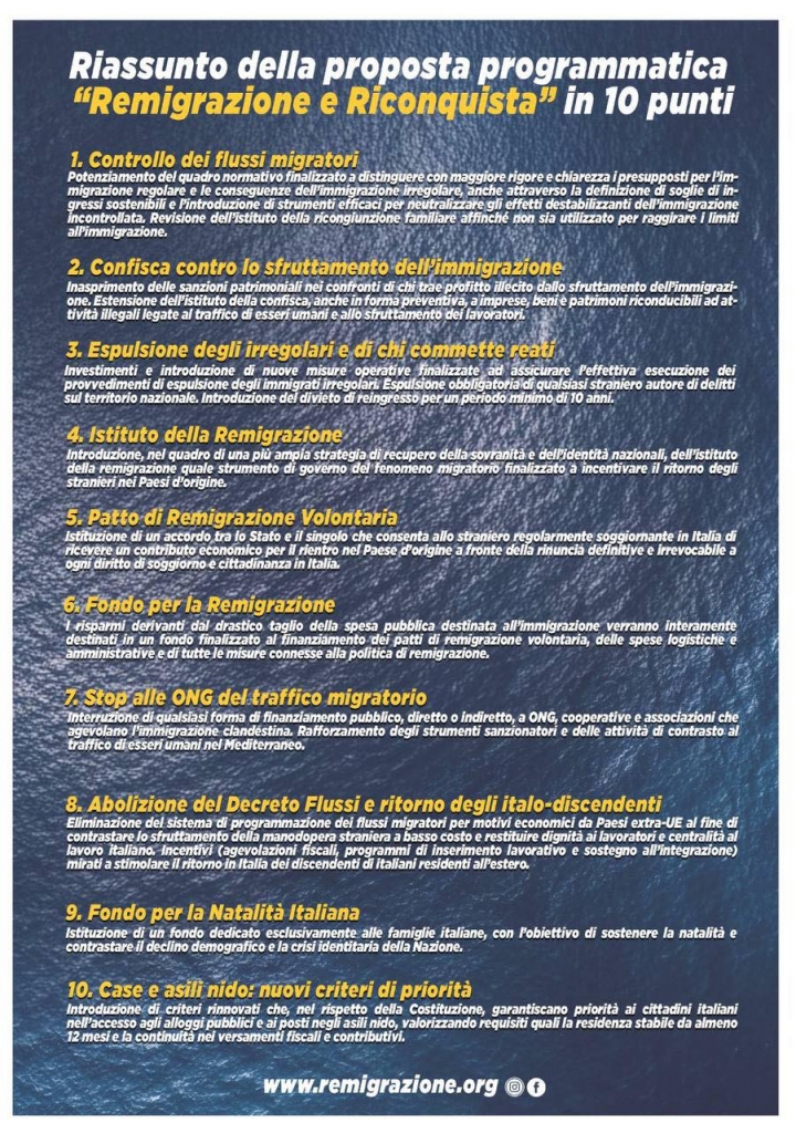 «Avec cette initiative nous voulons donner une réponse concrète à un thème que la politique continue d’ignorer. La rémigration n’est pas un slogan mais un projet réel visant à replacer les Italiens au cœur de l’avenir de notre nation. En octobre, nous présenterons officiellement le comité « Remigration et reconquête » dans un événement ouvert à tous, parce que cette bataille doit devenir un patrimoine collectif ». Luca Marsella, porte-parole de CasaPound.