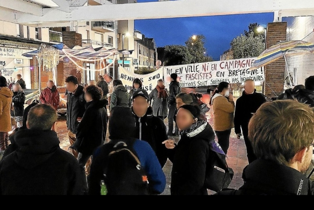 De l'autre : la Bretagne éveillée massivement rassemblée (c'est à dire 25 "résistants", moitié punks à chiens, moitié instits CFDT à la retraite depuis 30 ans et, ajoutez à cela, quelques bobos et quelques camés en mal de frissons...) venue exiger, au nom de la (leur) Liberté, l'interdiction de cette horrible rassemblement de nostalgiques de Vichy :