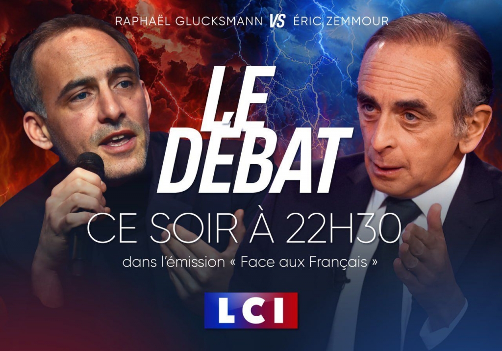 Mardi soir, sur LCI : le débat, Eric Zemmour face à Raphaël Glucksmann