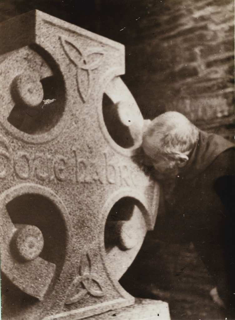 Sur la photo, Dom Alexis Presse, fondateur de l'abbaye de Boquen, embrassant la croix celtique sur la tombe de Yann Vari Perrot à Koad keo.