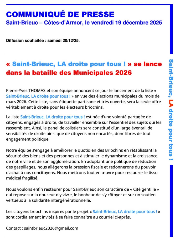 Nos lecteurs de Saint-Brieuc et ses alentours qui veulent soutenir la liste de Pierre-Yves Thomas peuvent écrire à : saintbrieuc2026@gmail.com