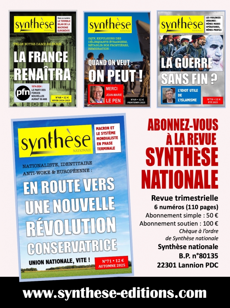 En contribuant à la souscription patriotique 2025 de Synthèse nationale, non seulement, vous recevrez une revue résolument engagée mais, en plus, vous nous aiderez à développer notre combat pour l’indispensable redressement de notre Nation et notre Civilisation…