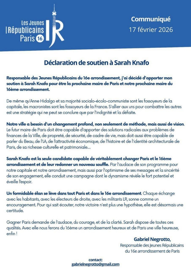 À Paris XVIe, les Jeunes Républicains (LR) rejoignent Sarah Knafo