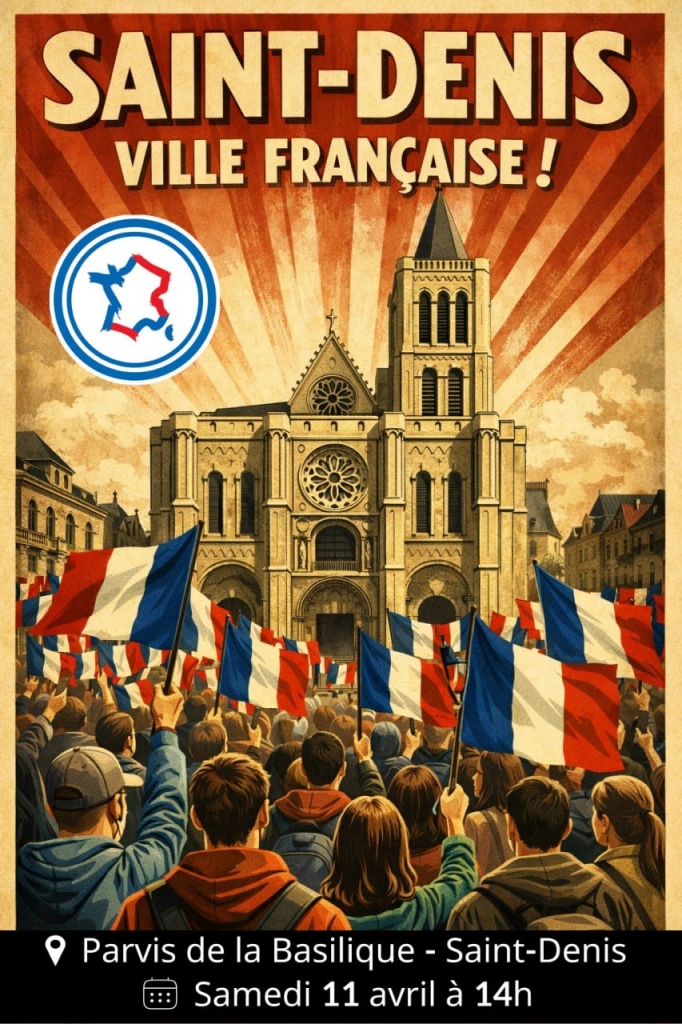 Samedi 11 avril à 14h, sur le Parvis de la Basilique Saint-Denis, nécropole des rois de France, le Parti de la France organise un rassemblement pour rappeler que Saint-Denis reste une ville française, qu'elle ne doit pas devenir le laboratoire de l'islamo-gauchisme et de l'anti-France.